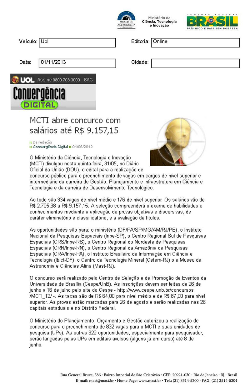 UOL | MCTI abre concurso com salários até R$ 9.157,15