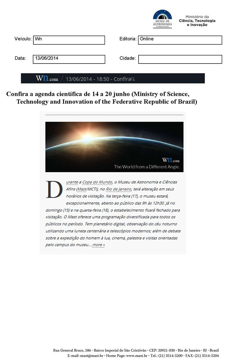 Wn.com | Confira a agenda científica de 14 a 20 de junho