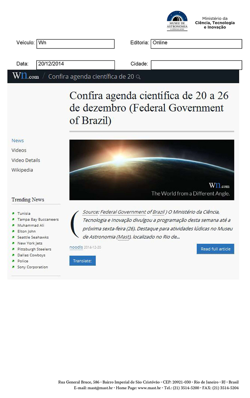 Wn.com | Confira a agenda científica de 20 a 26 de dezembro