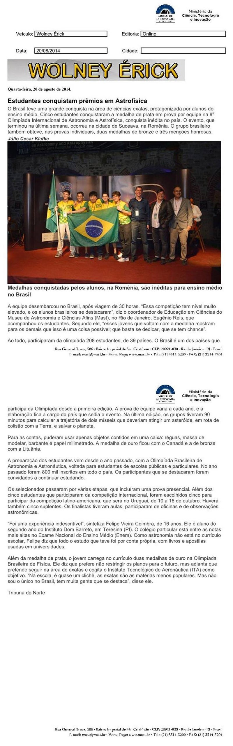 Wolney Érick | Estudantes conquistam prêmio em Astrofísica