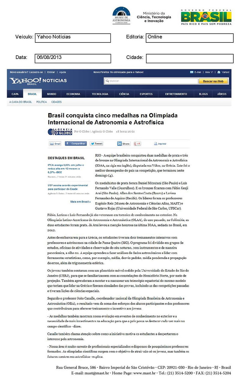 Yahoo Notícias | Brasil conquista cinco medalhas na Olimpíada Internacional de Astronomia e Astrofísica