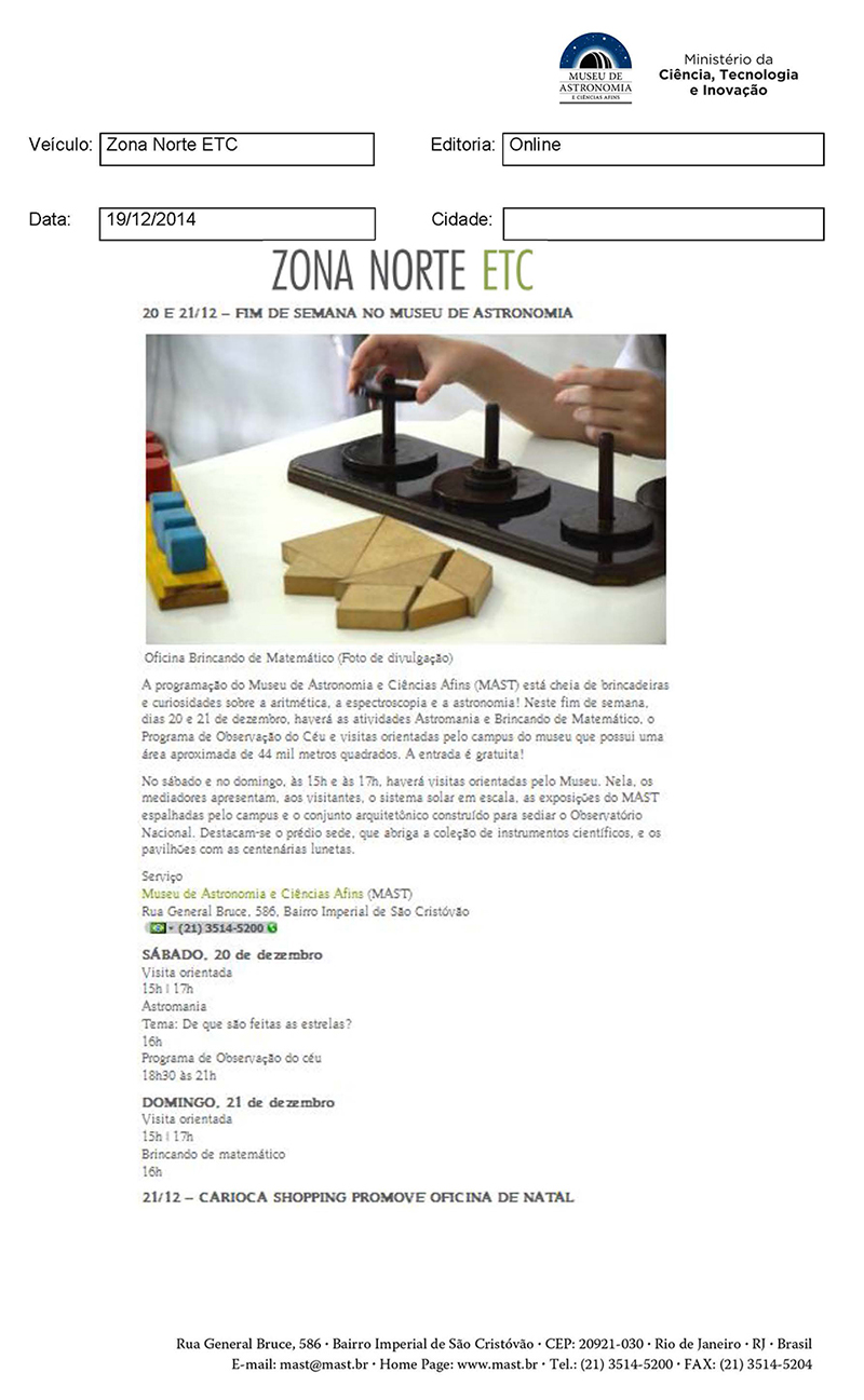 Zona Norte - ETC | Fim de Semana no Museu de Astronomia
