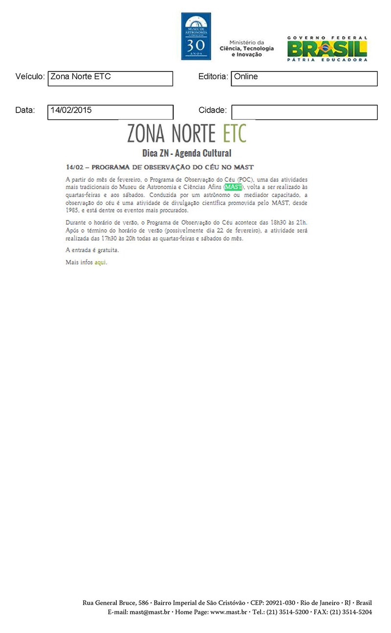 Zona Norte - ETC | Programa de Observação do Céu no MAST