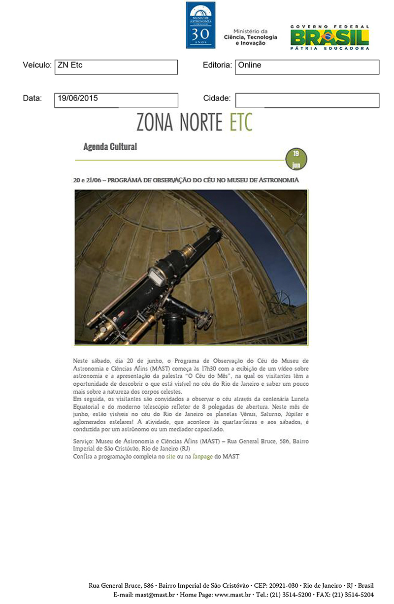 Zona Norte - ETC | Programa de Observação do Céu no Museu de Astronomia