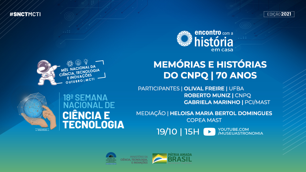 O Conselho Nacional de Desenvolvimento Científico e Tecnológico (CNPq) celebra 70 anos de fomento à pesquisa no País. Desde a sua criação, em 1951, quando era chamado de Conselho Nacional de Pesquisas, a instituição atendia a uma antiga aspiração da comunidade científica, por um órgão que promovesse e sistematizasse a pesquisa científica e o seu incentivo. Para destacar o papel fundamental do CNPq no desenvolvimento científico e tecnológico do País, o Museu de Astronomia e Ciências Afins (MAST) promove mais uma edição do Encontro com a História em Casa, no próximo dia 19 de outubro (terça-feira), a partir das 15h, pelo Canal do MAST no YouTube, acessível pelo link https://www.youtube.com/c/MuseudeAstronomiaeCi%C3%AAnciasAfins .