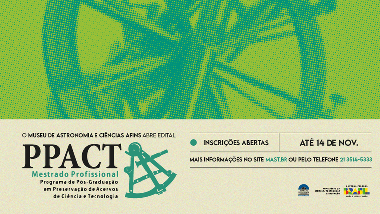 O edital para o Curso de Mestrado em Preservação de Acervos de Ciência e Tecnologia (PPACT), modalidade profissional, já está disponível na página do PPACT/MAST. As inscrições vão até o dia 14 de novembro.