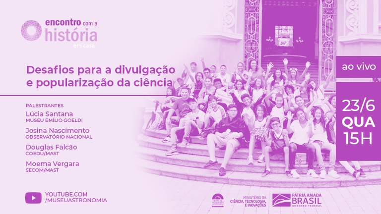 O conhecimento científico é fundamental para a sociedade e as instituições de pesquisa buscam formas de apresentar e veicular os trabalhos de seus especialistas fora dos seus círculos profissionais. Para mostrar algumas dessas ações e formas de levar conteúdo ao púbico, o Museu de Astronomia e Ciências Afins (MAST) vai apresentar live Desafios para a Divulgação e Popularização da Ciência na nova edição do Encontro com a História em Casa. Na próxima quarta-feira (23), às 15h, no Canal do MAST no YouTube (https://www.youtube.com/watch?v=G2tnNPVsWlo), representantes de instituições de pesquisa vão contar como é feita a comunicação entre pares do conhecimento científico, a difusão da ciência veiculada com a comunidade e com seus públicos.