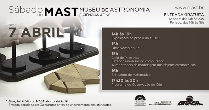 Um ambiente de interação, exploração e conhecimento para o público se divertir e aprender com experiências que vão desde a realização de oficinas de astronomia, à observação do céu por meio de telescópios. É com esse propósito que o Museu de Astronomia e Ciências Afins (MAST) oferece neste sábado (7), uma série de atividades gratuitas voltadas para crianças, jovens e adultos conhecerem o universo da ciência e tecnologia.