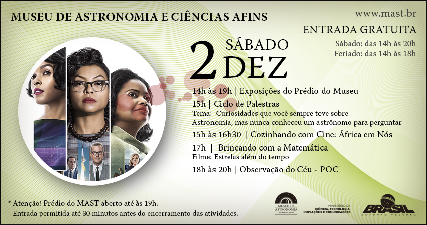 E após entender um pouco mais sobre o Universo, que tal assistir a um filme que conta a história de mulheres que foram fundamentais para levar o primeiro homem ao espaço? A oficina Brincando com a Matemática vai exibir "Estrelas além do tempo", que narra a história de três mulheres negras que venceram preconceitos através da coragem, genialidade e matemática, na época da corrida espacial em meio à disputas ideológicas e científicas, no período da Guerra Fria. Após a exibição do filme, acontecerá um bate papo sobre a presença das mulheres negras nas ciências exatas no Brasil.