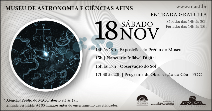 Uma das atrações é o Planetário Inflável Digital, que inaugura neste sábado uma nova fase e passa exibir sessões com conteúdos temáticos. Esta edição traz um pouco das mais diversas culturas estelares, tais como, a constelação tupi-guarani de Anta do Norte. A atividade, que está entre as de maior sucesso no MAST, permite que o público veja as projeções do céu, observe e entenda os movimentos celestes, e conheça as constelações mitológicas.