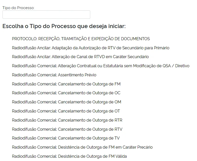 Escolha o Tipo de Processo que deseja formalizar a abertura junto ao Órgão. Visualize orientações específicas parando o mouse sobre cada Tipo: