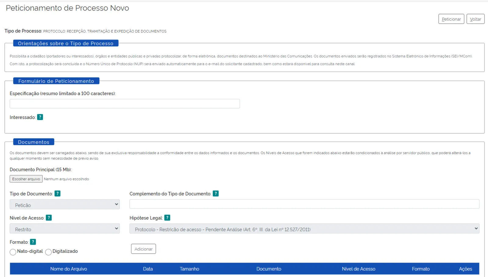 Possibilita o envio de documentos digitais, visando formar novo processo no SEI-MCom.
