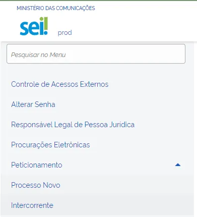 Após logado no Acesso Externo do SEI, na coluna da esquerda, acesse “Intercorrente” nos menus do Peticionamento Eletrônico