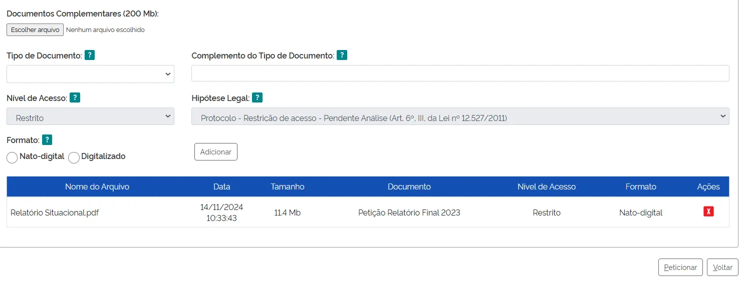 - Basta clicar em “Escolher arquivo”, preencher os campos pertinentes e clicar em “Adicionar” para cada documento que pretende peticionar.