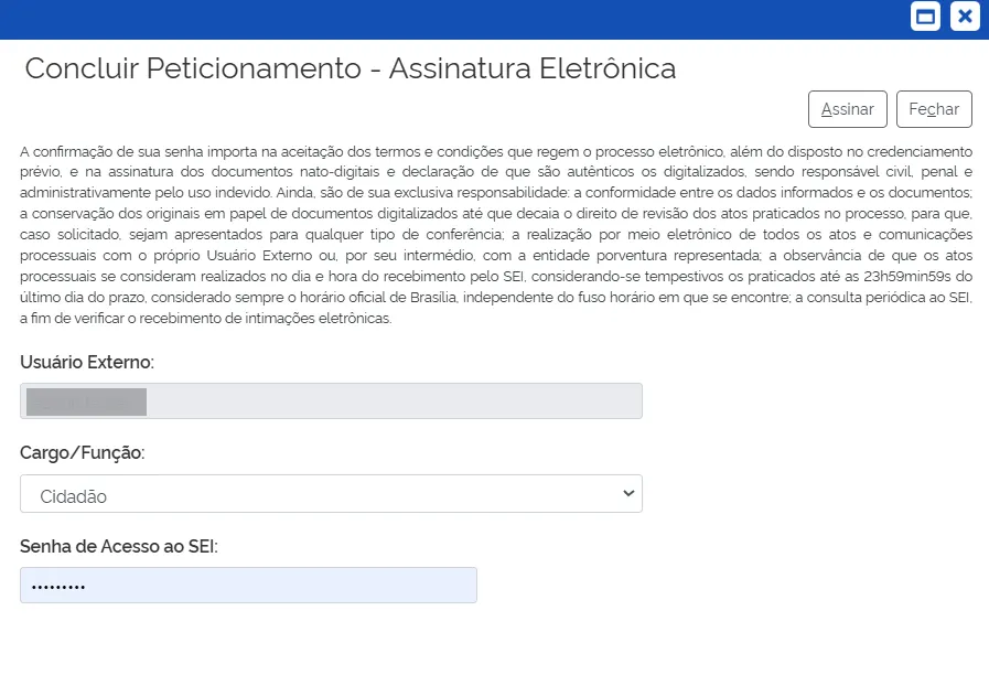 Na janela aberta, o Usuário Externo deve selecionar o “Cargo/Função”: “cidadão”, confirmar sua “Senha de Acesso ao SEI” e clicar no botão “Assinar” para que a Assinatura Eletrônica e o processamento do peticionamento seja de fato iniciado.