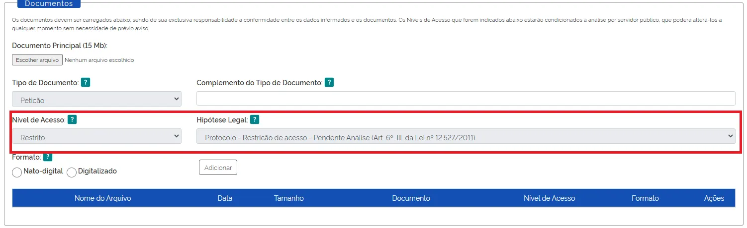| 💡 Os Níveis de Acesso que forem indicados nos documentos serão analisados por servidor público, que poderá alterá-los a qualquer momento sem necessidade de prévio aviso. Lembramos que, em regra, os documentos são públicos e qualquer hipótese de restrição deve ser indicada. |