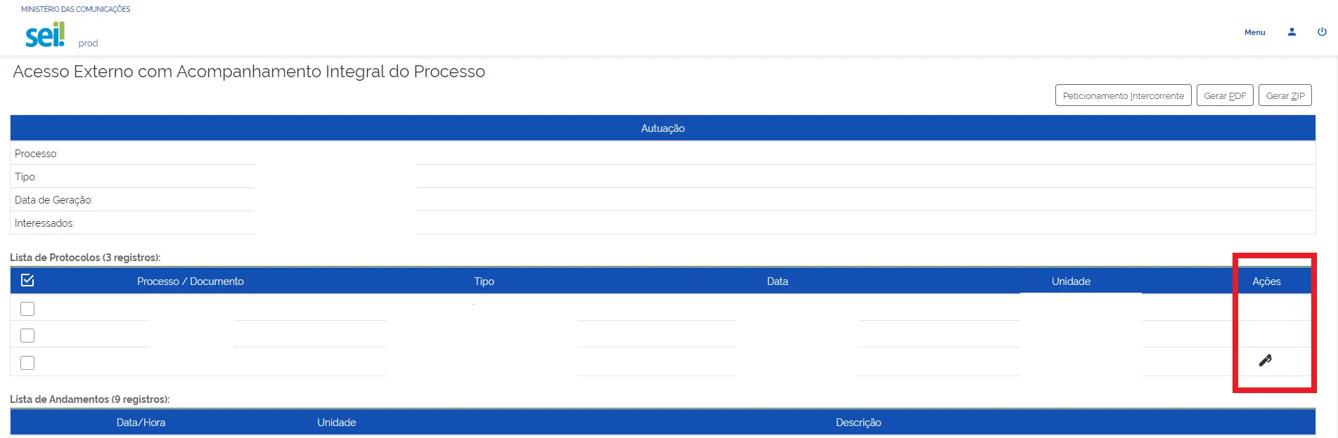 A caneta indica documento gerado pela unidade do SEI-MCom e disponibilizado para assinatura do Usuário Externo. Estando de acordo com o conteúdo, o usuário pode assinar, clicando no ícone da caneta.
