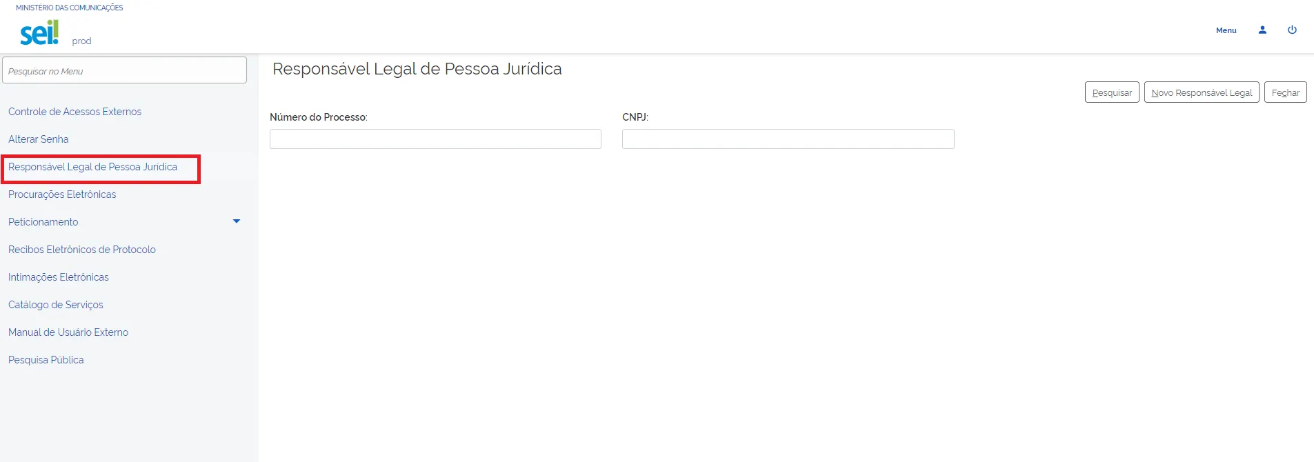 Se o Responsável Legal pela Pessoa Jurídica tiver sido alterado na Receita Federal, é necessário que o novo Responsável Legal entre no SEI-MCom e realize novo cadastro de Responsável Legal, conforme passos indicados no tópico Formalizar Responsável Legal de Pessoa Jurídica.