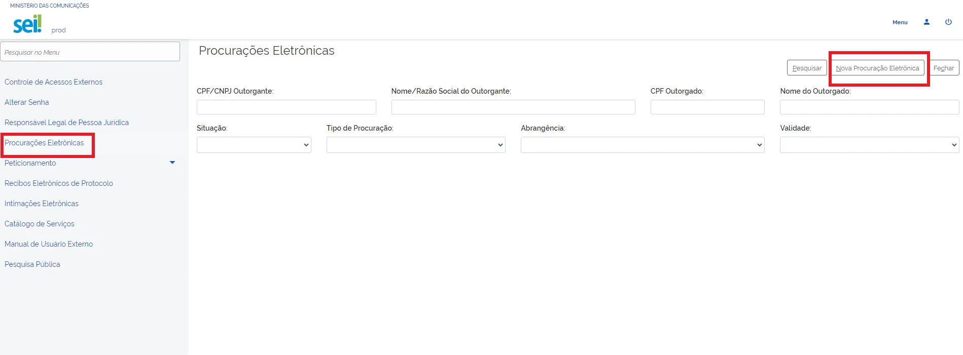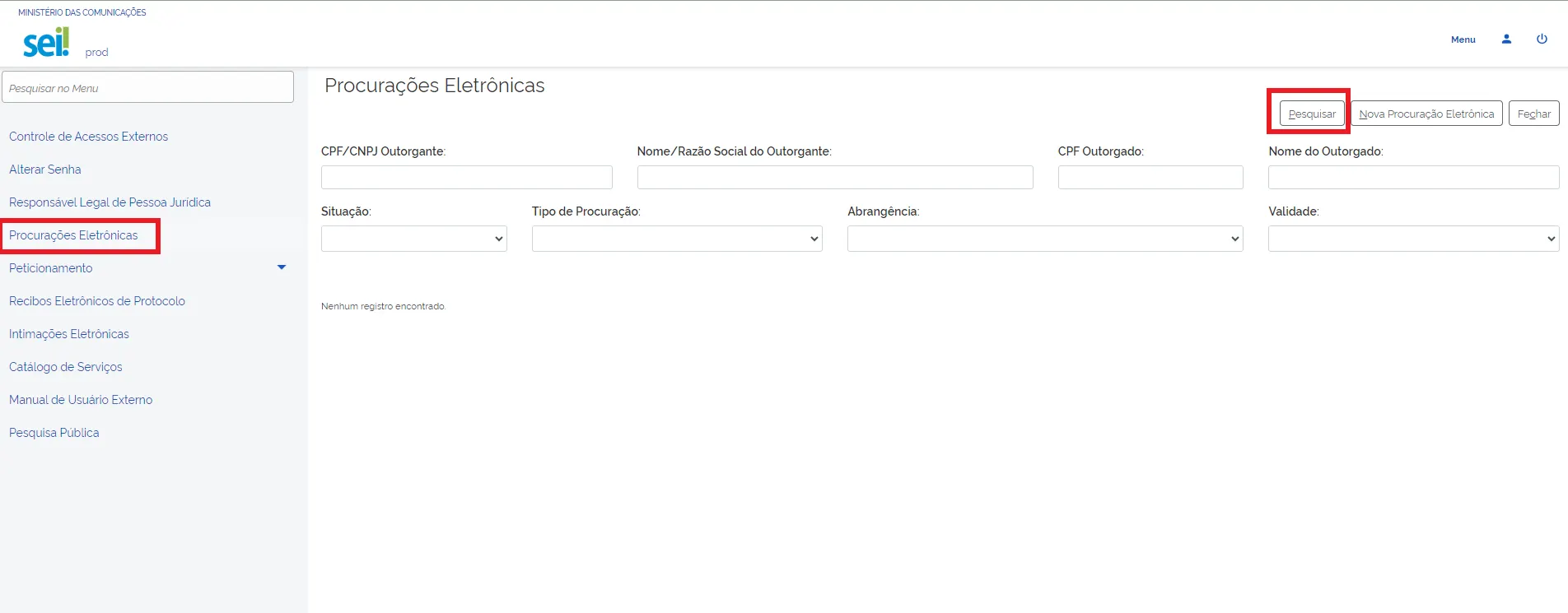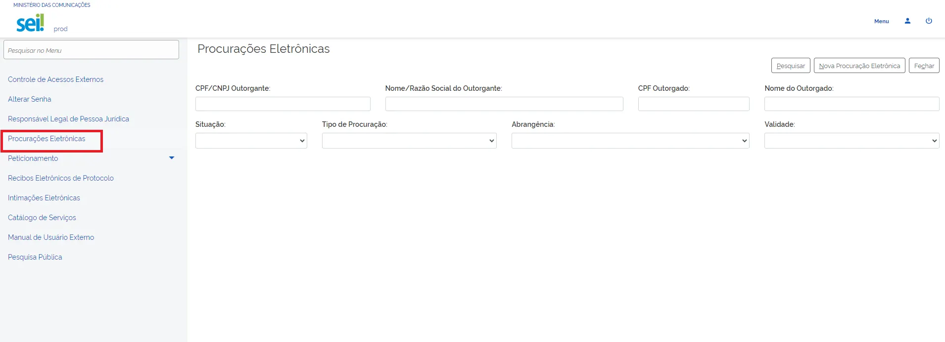Ao acessar o menu “Procurações Eletrônicas”, o Usuário Externo terá acesso a todas as Procurações em que figurar como Outorgado.