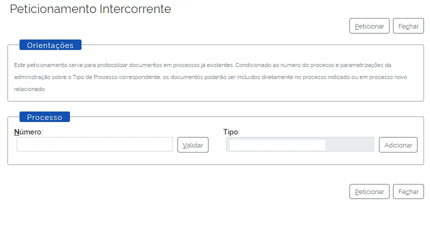 Na seção “Processo”, inserir o número do processo no qual quer peticionar e clicar no botão “Validar”.