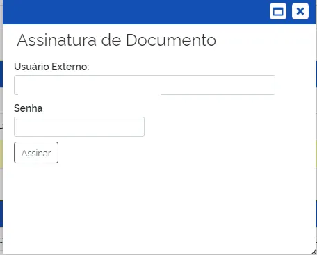 O Usuário Externo poderá assinar documentos gerados pelo MCom por meio de assinatura cadastrada, mediante login e senha de acesso do usuário. É necessário que o usuário possua cadastro liberado.