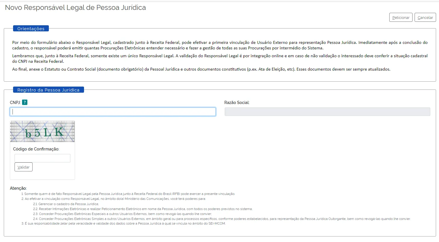 - O Responsável Legal pelo CNPJ na Receita Federal deverá necessariamente possuir cadastro de Usuário Externo no SEI-MCom.