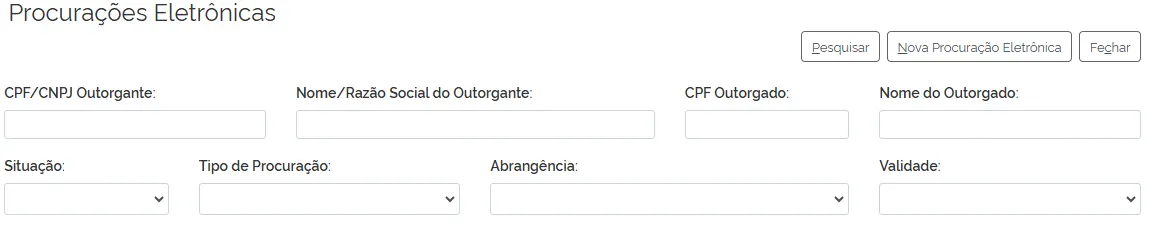 O Responsável Legal pode emitir Procurações Eletrônicas Especiais e Procurações Eletrônicas Simples, com indicação de poderes específicos, abrangência e prazo de validade, gerenciando-as por meio do menu “Procurações Eletrônicas”: