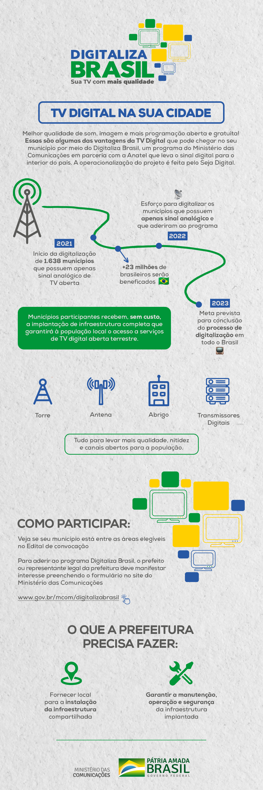 O compromisso do MCom é levar o sinal de TV digital a todo o país e, para isso, criou o Digitaliza Brasil. A meta até o final de 2022 é entregar e instalar os equipamentos para transmissão digital em 1.638 municípios brasileiros que hoje possuem apenas o sinal analógico. A ação do MCom deve beneficiar 23 milhões de pessoas. A conclusão da digitalização do sinal de TV, em todo o Brasil, deve ocorrer até 2023.
