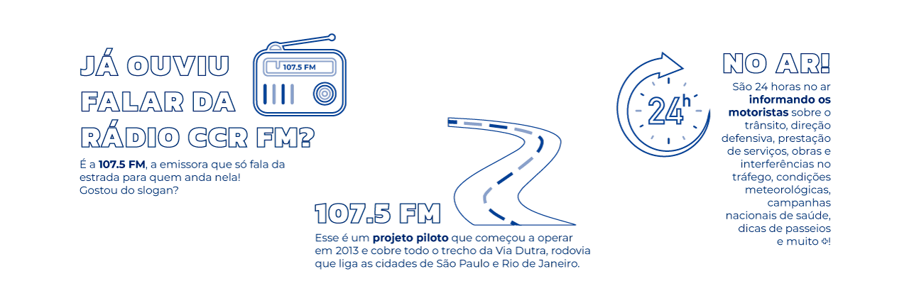 A primeira rádio desse tipo que recebeu outorga do Ministério das Comunicações para funcionar foi a CCR FM, da CCR NovaDutra, que foi autorizada para fins científicos ou experimentais. É a 107.5 FM, a emissora que só fala da estrada, para quem anda nela! Gostou do slogan?