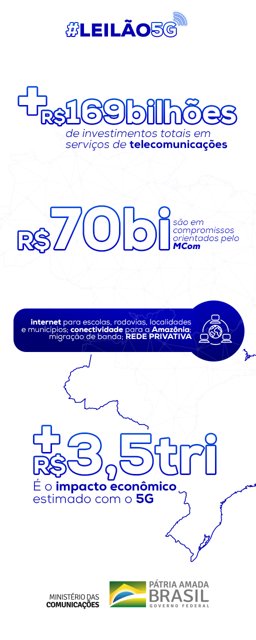 De acordo com os cálculos, R$ 70 bilhões devem ser investidos pelas operadoras de telecomunicações em todo o Brasil para cumprir as obrigações previstas no edital . Entre os compromissos estão a ampliação da cobertura 4G em mais de 9 mil localidades e em 31 mil quilômetros de rodovias; a expansão da infraestrutura de fibra ótica; e a implantação da Projeto Amazônia Integrada e Sustentável e da Rede Privativa da Administração Pública Federal.