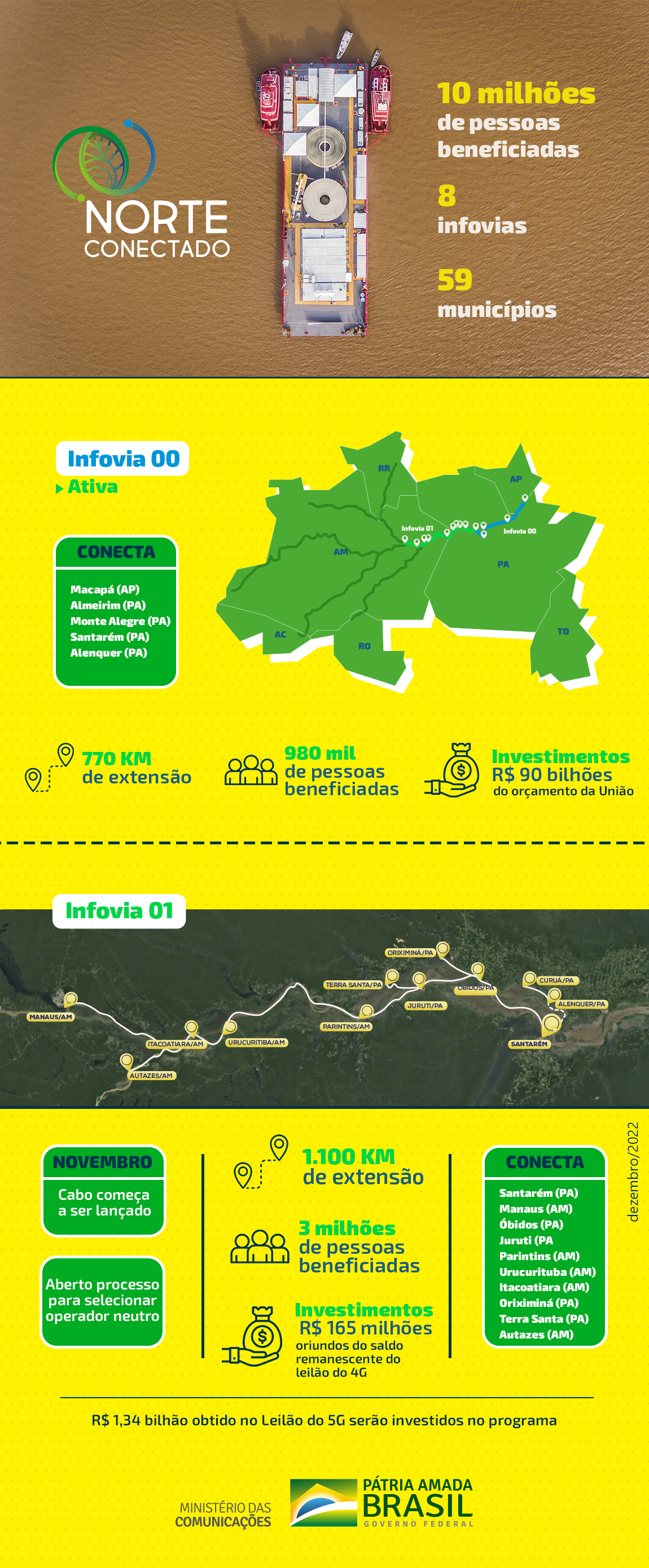 O Ministério das Comunicações (MCom) levou mais conectividade e promoveu inclusão digital na região Amazônica com o Norte Conectado . Criado em 2020, o programa busca expandir a infraestrutura de comunicações e fortalecer políticas públicas. Ao todo, serão lançadas no leito de rios 8 infovias com 12 mil quilômetros de extensão, que conectam 59 municípios do Acre, Amapá, Amazonas, Pará, Rondônia e Roraima.