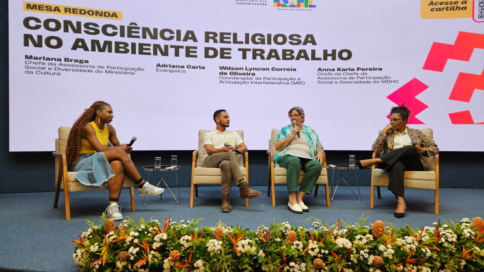 A mesa redonda que debateu consciência religiosa no ambiente de trabalho contou com a moderação de Mariana Braga, chefe da Assessoria de Participação Social e Diversidade do Ministério da Cultura, e dos participantes Wdson Lyncon Correia de Oliveira, coordenador de participação do Ministério da Igualdade Racial; Adriana Carla, representante do movimento Evangelics; e Anna Karla Pereira, chefe da Assessoria de Participação Social e Diversidade do Ministério dos Direitos Humanos e Cidadania.
