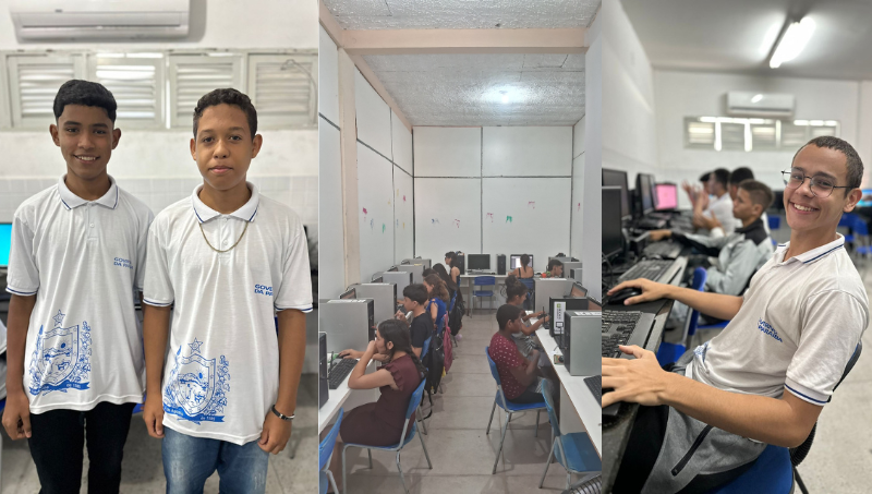 Nas extremidades, alunos do curso de informática premiados com medalha de bronze na OPI-Olimpíada Paraibana de Informática organizada pela UFCG. Ao centro, demais alunos da Escola Pública Estadual Padre Emídio Viana Correia. Fotos: Divulgação