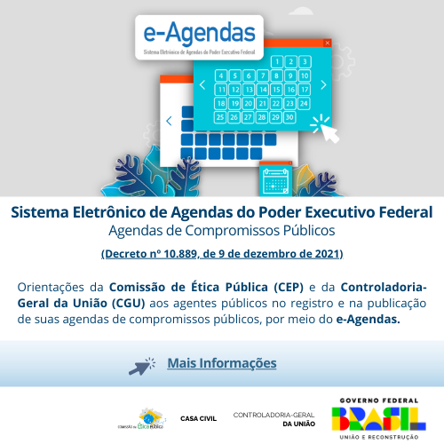 A Comissão de Ética Pública (CEP), em parceria com a Controladoria-Geral da União (CGU), divulga orientações aos integrantes da Alta Administração federal sobre obrigações e exigências do cargo em relação à transparência das agendas públicas e o correto preenchimento do sistema e-Agendas.