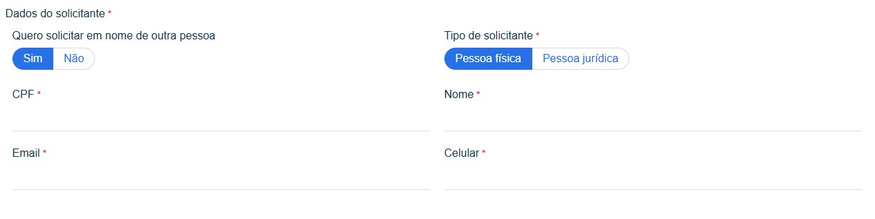 b) Não serão aceitos cadastros de pessoas jurídicas. Apesar de estar disponível, o campo apenas pode ser utilizado para outros tipos de solicitação.