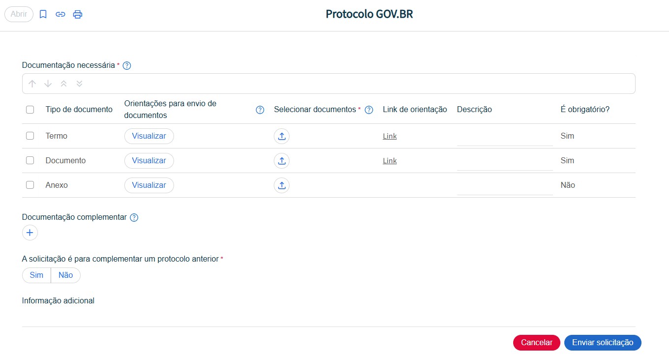 10) No campo "A solicitação é para complementar um protocolo anterior" deve ser selecionado "Não". Quaisquer outras informações julgadas relevantes devem ser inseridas no campo "Informação adicional".