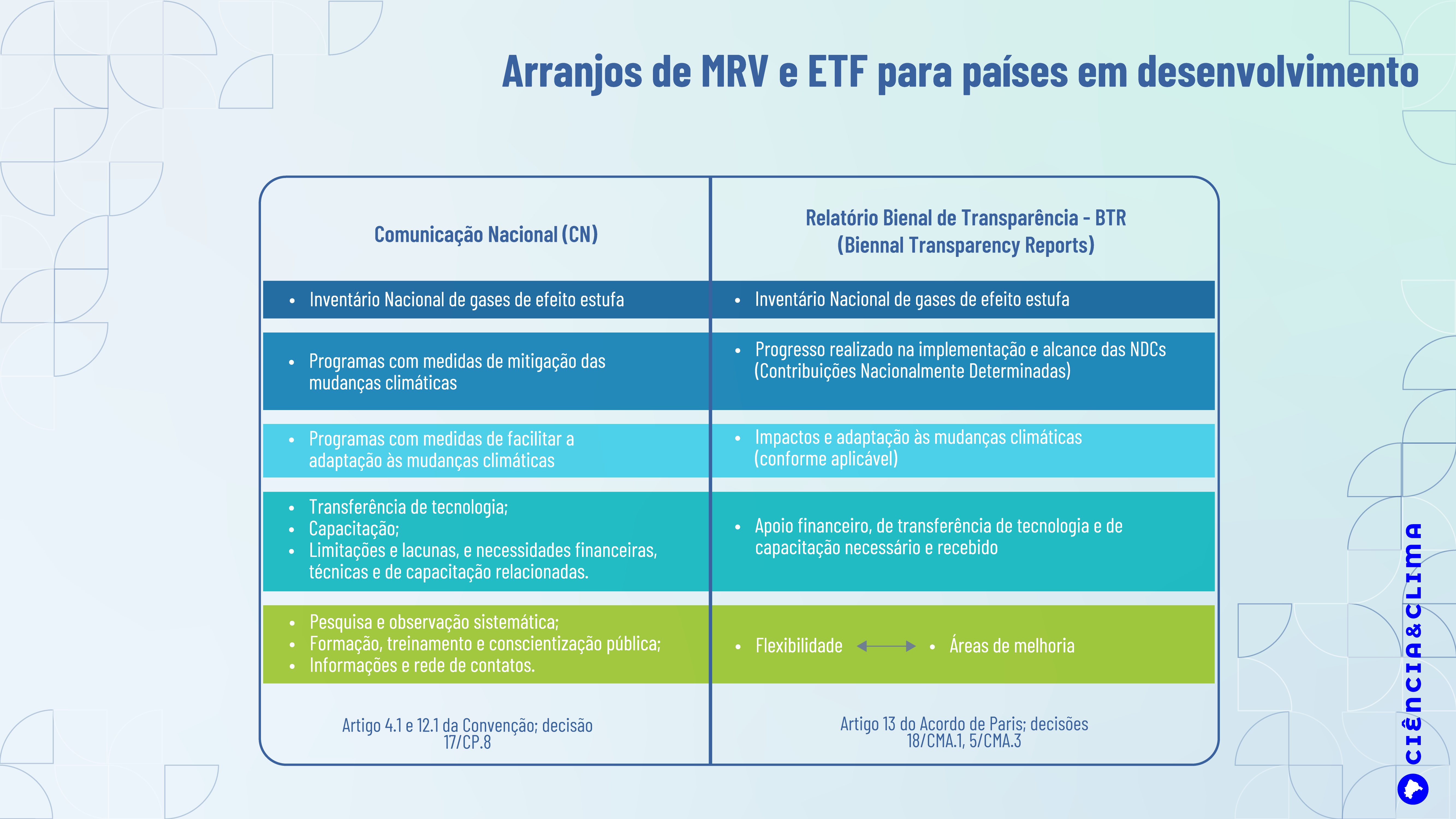 A partir de 2024, o Brasil passou a elaborar e submeter à Convenção do Clima o Relatório Bienal de Transparência, compromisso assumido pelas Partes signatárias da Convenção do Clima em 2018 para atender à estrutura de transparência do Artigo 13 do Acordo de Paris.