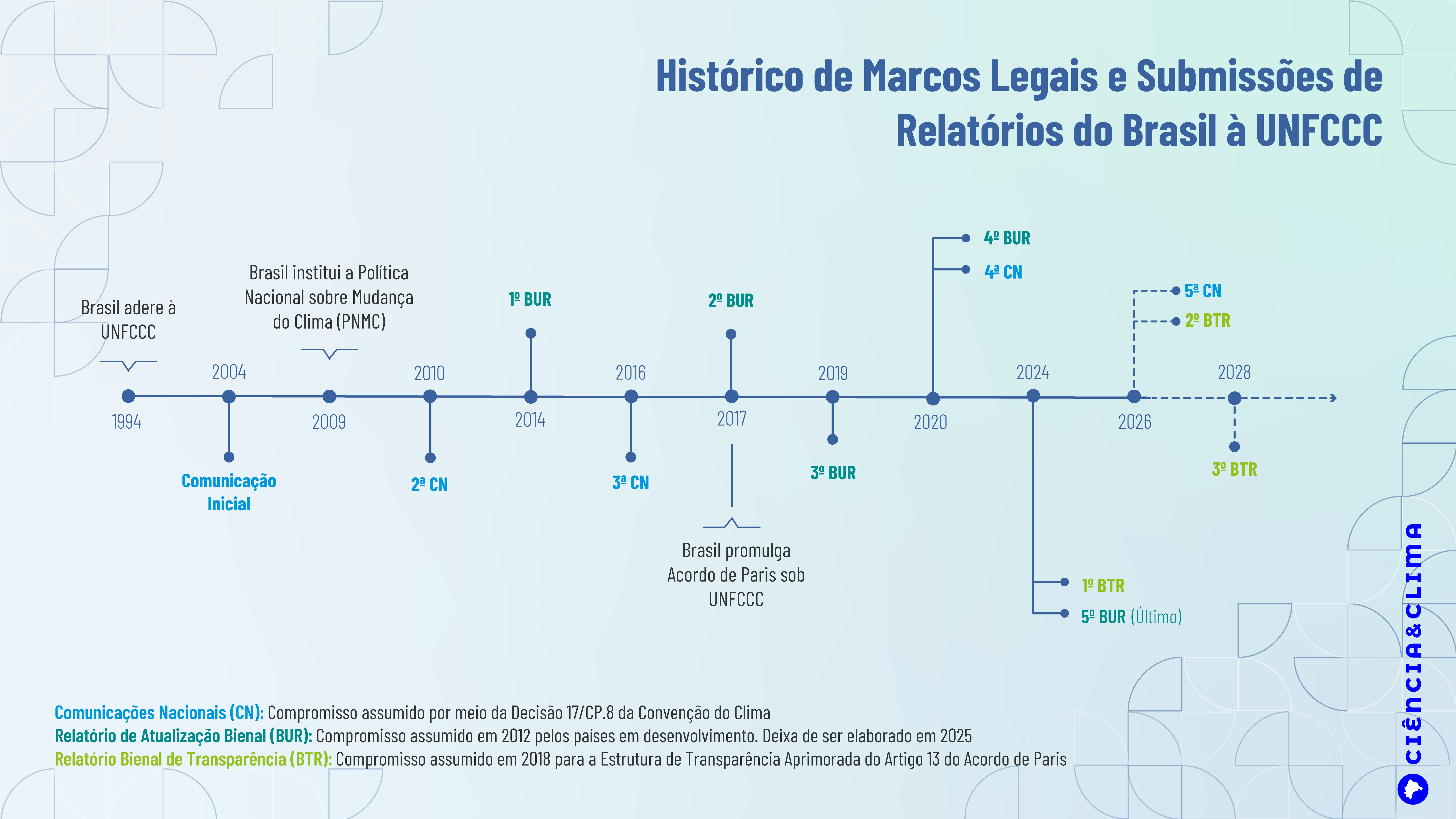 Ao aderir à Convenção-Quadro das Nações Unidas sobre Mudança do Clima (United Nations Framework Convention on Climate Change – UNFCCC, na sigla em inglês) e seu Acordo de Paris, o Brasil se comprometeu a informar periodicamente o panorama geral sobre os esforços empreendidos na agenda climática. Entre as obrigações está a de desenvolver e atualizar periodicamente o Inventário Nacional de emissões e remoções de GEE e as ações de combate à mudança do clima, entre outras.