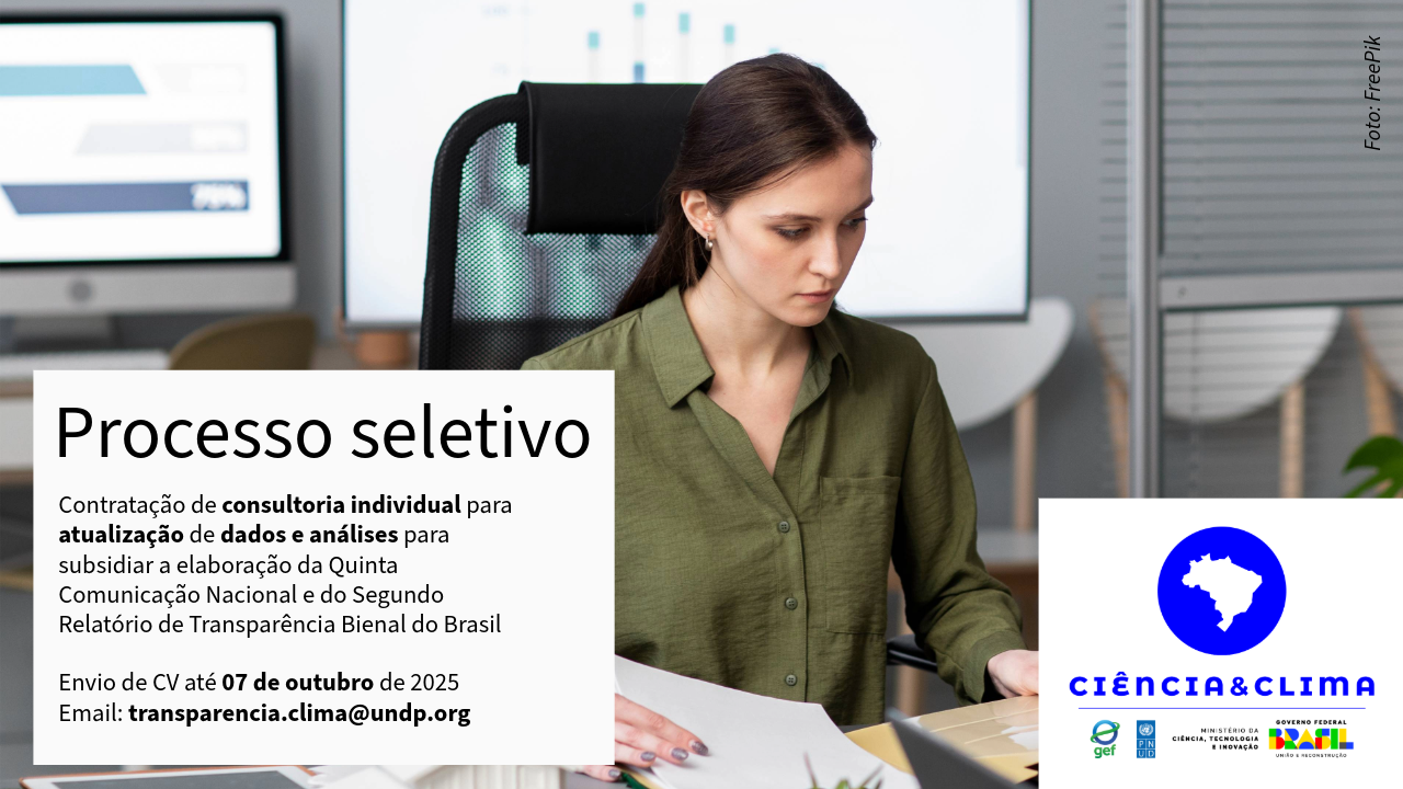 Está aberto, no âmbito do Projeto BRA/23/G31, processo seletivo para consultoria individual na modalidade de pagamento por produto. Essa contratação tem por objetivo contratar 1 especialista para análises e atualização de dados que farão parte de capítulos da Quinta Comunicação Nacional (5CN) e do Segundo Relatório Bienal de Transparência (BTR2), a serem submetidos à UNFCCC.O envio de currículos deve ser realizado até 07 de outubro de 2025, por meio do e-mail: transparencia.clima@undp.org.Maiores informações estão disponíveis no Termo de Referência a seguir.Hiperlink com o PDF em anexo: Termo de Referência_IC_5CN BTR2