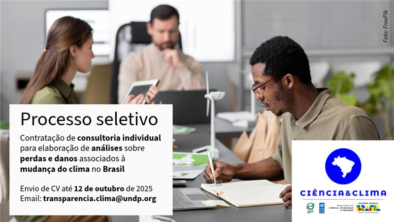 Está aberto, no âmbito do Projeto BRA/23/G31, processo seletivo para consultoria individual na modalidade de pagamento por produto. Essa contratação tem por objetivo contratar 1 especialista para realização de análises sobre perdas e danos associados à mudança do clima no Brasil.O envio de currículos deve ser realizado até 12 de outubro de 2025, por meio do e-mail: transparencia.clima@undp.org.Maiores informações estão disponíveis no Termo de Referência a seguir.Hiperlink com o PDF em anexo: Termo de Referência_IC_Perdas e Danos