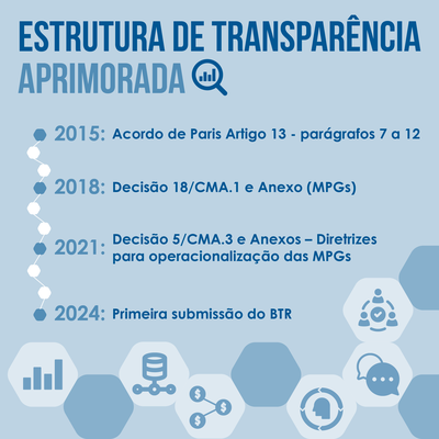 A submissão de Relatórios Bienais de Transparência (BTR, sigla em inglês para Biennial Transparency Reports) é um compromisso assumido pelas Partes signatárias da Convenção do Clima durante a COP24 e CMA 1 (Decisão 18/CMA.1), realizada em 2018, em Katowice, Polônia, quando foram adotadas as Modalidades, Procedimentos e Diretrizes (MPGs, sigla em inglês para Modalities, Procedures and Guidelines) para a estrutura de transparência do Artigo 13 (considerando os parágrafos 07 a 12) do Acordo de Paris, assinado em 2015, e que se aplicam a todas as Partes. Posteriormente, em 2021 a Decisão 5/CMA.3 e Anexos estabeleceu as diretrizes para a operacionalização das MPGs.