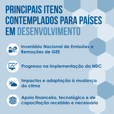 - Informações sobre o apoio necessário e recebido em matéria de financiamento, desenvolvimento e transferência de tecnologia e capacitação: os países em desenvolvimento devem fornecer informações sobre o apoio que necessitam e tenham recebido envolvendo financiamento, transferência de tecnologia e capacitação relacionadas à clima. Os dados contemplam ainda as barreiras existentes para atrair financiamento internacional e os canais de financiamento.