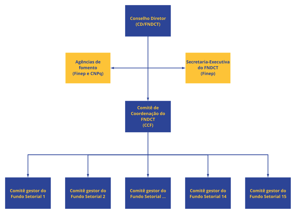 Compõem ainda as instâncias de governança o Comitê de Coordenação do FNDCT (CCF), a Secretaria-Executiva do FNDCT, exercida pela Finep, que para isso utiliza sua estrutura física e de pessoal, e os Comitês Gestores dos Fundos Setoriais, cuja composição possibilita a participação de amplos setores da sociedade nas decisões sobre as aplicações dos recursos dos Fundos Setoriais e permite a gestão compartilhada do planejamento, concepção, definição e acompanhamento das ações.