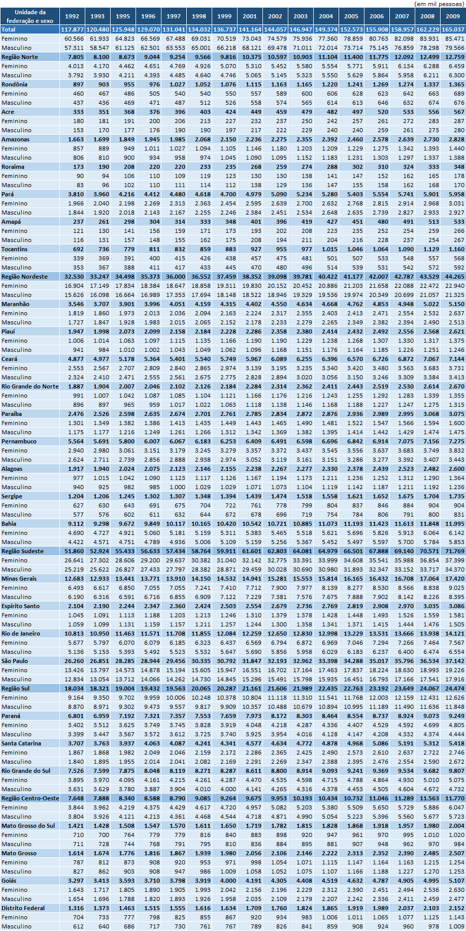 10.3 Brasil: População em idade ativa, por unidade da federação e sexo, 1992/2009
