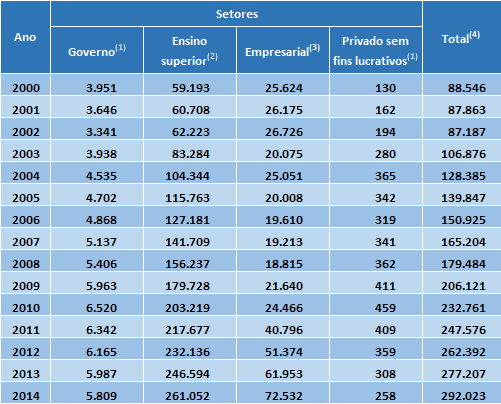 2) No setor ensino superior: o pessoal de apoio engloba os estudantes (exclusive os de doutorado, computados como pesquisadores) e o pessoal técnico do DGP/CNPq. As informações do DGP/CNPq estão disponíveis somente para os anos pares, a partir de 2000. Os dados para os anos ímpares foram obtidos com base na média aritmética dos anos adjacentes.