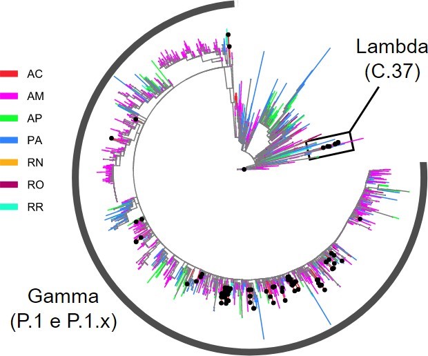 Figura 1: Árvore evolutiva de todas as sequências disponíveis e de boa qualidade provindas da região Norte do país, disponíveis na base de dados GISAID no dia 23/08/2021. Em destaque, as variantes Gamma e Lambda.