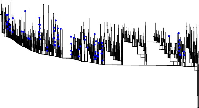 Figura 2: Árvore evolutiva de todas as sequências da variante P.1 (Gamma) disponíveis e de boa qualidade provindas da região Norte do país, disponíveis na base de dados GISAID no dia 23/08/2021. Em azul, sequências provenientes do estado do Acre, demonstrando ao menos três conjuntos diferenciados.