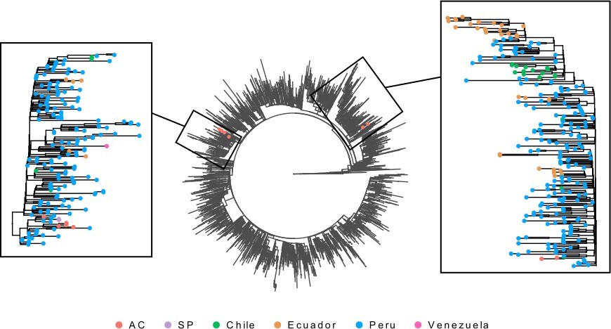 Figura 3. Árvore filogenética de todas as amostras da linhagem C.37 (Lambda) com boa qualidade disponíveis na base de dados GISAID. É possível observar que ocorreram duas introduções da variante no Acre.