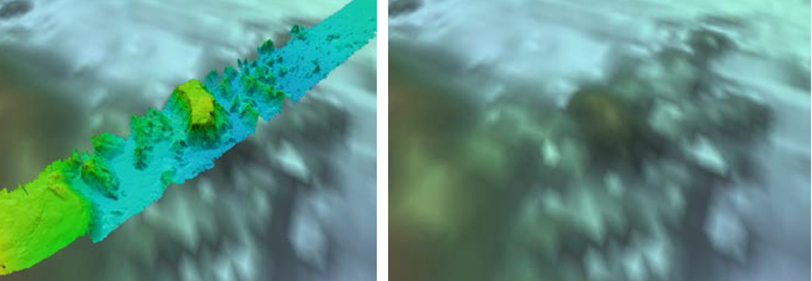 À esquerda, imagem elaborada a partir da tecnologia batimetria multifeixe utilizada para mapear o fundo do oceano com alta resolução.