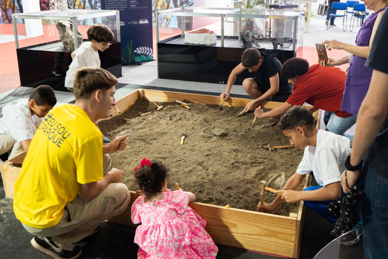 Pequenos futuros paleontólogos cavavam e remexiam, ansiosos, uma caixa de areia montada no meio da 21ª Semana Nacional de Ciência e Tecnologia (SNCT). Aos poucos, foram surgindo os primeiros sinais de que o esforço estava valendo a pena. Um ossinho aqui, outro pedacinho ali, e de repente boa parte do nosso amigo “Gnathovorax” já estava à vista, para a alegria da criançada.